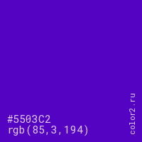 Цвет #5503C2 в цветовой модели RGB обозначается тремя октетами (85, 3, 194) в десятичном формате и #5503C2 в шестнадцатиричном (hex) формате, которые являются интенсивностью красного 85 (hex 55), интенсивность зелёного 3 (hex 03) и интенсивность синего 194 (hex C2).