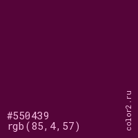 Цвет #550439 в цветовой модели RGB обозначается тремя октетами (85, 4, 57) в десятичном формате и #550439 в шестнадцатиричном (hex) формате, которые являются интенсивностью красного 85 (hex 55), интенсивность зелёного 4 (hex 04) и интенсивность синего 57 (hex 39).