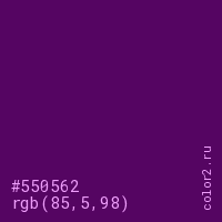 Цвет #550562 в цветовой модели RGB обозначается тремя октетами (85, 5, 98) в десятичном формате и #550562 в шестнадцатиричном (hex) формате, которые являются интенсивностью красного 85 (hex 55), интенсивность зелёного 5 (hex 05) и интенсивность синего 98 (hex 62).