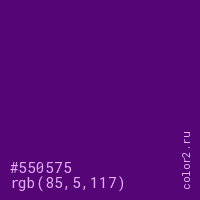 Цвет #550575 в цветовой модели RGB обозначается тремя октетами (85, 5, 117) в десятичном формате и #550575 в шестнадцатиричном (hex) формате, которые являются интенсивностью красного 85 (hex 55), интенсивность зелёного 5 (hex 05) и интенсивность синего 117 (hex 75).