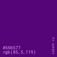 Цвет #550577 в цветовой модели RGB обозначается тремя октетами (85, 5, 119) в десятичном формате и #550577 в шестнадцатиричном (hex) формате, которые являются интенсивностью красного 85 (hex 55), интенсивность зелёного 5 (hex 05) и интенсивность синего 119 (hex 77).