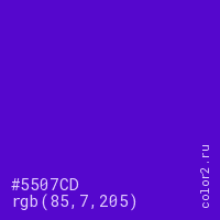 Цвет #5507CD в цветовой модели RGB обозначается тремя октетами (85, 7, 205) в десятичном формате и #5507CD в шестнадцатиричном (hex) формате, которые являются интенсивностью красного 85 (hex 55), интенсивность зелёного 7 (hex 07) и интенсивность синего 205 (hex CD).