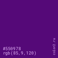 Цвет #550978 в цветовой модели RGB обозначается тремя октетами (85, 9, 120) в десятичном формате и #550978 в шестнадцатиричном (hex) формате, которые являются интенсивностью красного 85 (hex 55), интенсивность зелёного 9 (hex 09) и интенсивность синего 120 (hex 78).