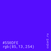 Цвет #550DFE в цветовой модели RGB обозначается тремя октетами (85, 13, 254) в десятичном формате и #550DFE в шестнадцатиричном (hex) формате, которые являются интенсивностью красного 85 (hex 55), интенсивность зелёного 13 (hex 0D) и интенсивность синего 254 (hex FE).