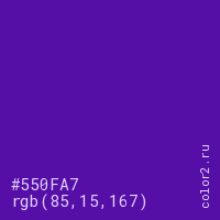 Цвет #550FA7 в цветовой модели RGB обозначается тремя октетами (85, 15, 167) в десятичном формате и #550FA7 в шестнадцатиричном (hex) формате, которые являются интенсивностью красного 85 (hex 55), интенсивность зелёного 15 (hex 0F) и интенсивность синего 167 (hex A7).