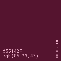 Цвет #55142F в цветовой модели RGB обозначается тремя октетами (85, 20, 47) в десятичном формате и #55142F в шестнадцатиричном (hex) формате, которые являются интенсивностью красного 85 (hex 55), интенсивность зелёного 20 (hex 14) и интенсивность синего 47 (hex 2F).