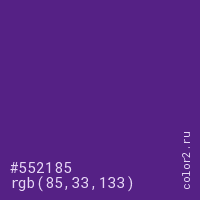 Цвет #552185 в цветовой модели RGB обозначается тремя октетами (85, 33, 133) в десятичном формате и #552185 в шестнадцатиричном (hex) формате, которые являются интенсивностью красного 85 (hex 55), интенсивность зелёного 33 (hex 21) и интенсивность синего 133 (hex 85).