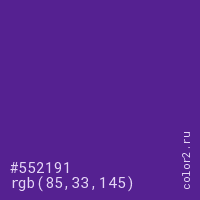 Цвет #552191 в цветовой модели RGB обозначается тремя октетами (85, 33, 145) в десятичном формате и #552191 в шестнадцатиричном (hex) формате, которые являются интенсивностью красного 85 (hex 55), интенсивность зелёного 33 (hex 21) и интенсивность синего 145 (hex 91).