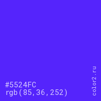 Цвет #5524FC в цветовой модели RGB обозначается тремя октетами (85, 36, 252) в десятичном формате и #5524FC в шестнадцатиричном (hex) формате, которые являются интенсивностью красного 85 (hex 55), интенсивность зелёного 36 (hex 24) и интенсивность синего 252 (hex FC).