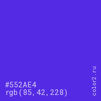 Цвет #552AE4 в цветовой модели RGB обозначается тремя октетами (85, 42, 228) в десятичном формате и #552AE4 в шестнадцатиричном (hex) формате, которые являются интенсивностью красного 85 (hex 55), интенсивность зелёного 42 (hex 2A) и интенсивность синего 228 (hex E4).