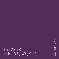 Цвет #552B5B в цветовой модели RGB обозначается тремя октетами (85, 43, 91) в десятичном формате и #552B5B в шестнадцатиричном (hex) формате, которые являются интенсивностью красного 85 (hex 55), интенсивность зелёного 43 (hex 2B) и интенсивность синего 91 (hex 5B).