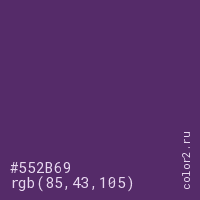 Цвет #552B69 в цветовой модели RGB обозначается тремя октетами (85, 43, 105) в десятичном формате и #552B69 в шестнадцатиричном (hex) формате, которые являются интенсивностью красного 85 (hex 55), интенсивность зелёного 43 (hex 2B) и интенсивность синего 105 (hex 69).
