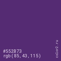 Цвет #552B73 в цветовой модели RGB обозначается тремя октетами (85, 43, 115) в десятичном формате и #552B73 в шестнадцатиричном (hex) формате, которые являются интенсивностью красного 85 (hex 55), интенсивность зелёного 43 (hex 2B) и интенсивность синего 115 (hex 73).