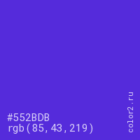 Цвет #552BDB в цветовой модели RGB обозначается тремя октетами (85, 43, 219) в десятичном формате и #552BDB в шестнадцатиричном (hex) формате, которые являются интенсивностью красного 85 (hex 55), интенсивность зелёного 43 (hex 2B) и интенсивность синего 219 (hex DB).