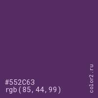 Цвет #552C63 в цветовой модели RGB обозначается тремя октетами (85, 44, 99) в десятичном формате и #552C63 в шестнадцатиричном (hex) формате, которые являются интенсивностью красного 85 (hex 55), интенсивность зелёного 44 (hex 2C) и интенсивность синего 99 (hex 63).