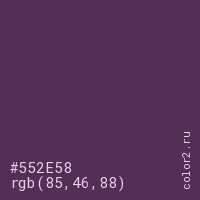 Цвет #552E58 в цветовой модели RGB обозначается тремя октетами (85, 46, 88) в десятичном формате и #552E58 в шестнадцатиричном (hex) формате, которые являются интенсивностью красного 85 (hex 55), интенсивность зелёного 46 (hex 2E) и интенсивность синего 88 (hex 58).