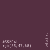 Цвет #552F41 в цветовой модели RGB обозначается тремя октетами (85, 47, 65) в десятичном формате и #552F41 в шестнадцатиричном (hex) формате, которые являются интенсивностью красного 85 (hex 55), интенсивность зелёного 47 (hex 2F) и интенсивность синего 65 (hex 41).