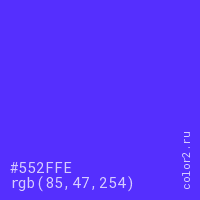 Цвет #552FFE в цветовой модели RGB обозначается тремя октетами (85, 47, 254) в десятичном формате и #552FFE в шестнадцатиричном (hex) формате, которые являются интенсивностью красного 85 (hex 55), интенсивность зелёного 47 (hex 2F) и интенсивность синего 254 (hex FE).