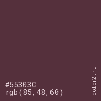 Цвет #55303C в цветовой модели RGB обозначается тремя октетами (85, 48, 60) в десятичном формате и #55303C в шестнадцатиричном (hex) формате, которые являются интенсивностью красного 85 (hex 55), интенсивность зелёного 48 (hex 30) и интенсивность синего 60 (hex 3C).