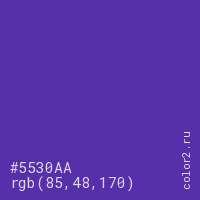 Цвет #5530AA в цветовой модели RGB обозначается тремя октетами (85, 48, 170) в десятичном формате и #5530AA в шестнадцатиричном (hex) формате, которые являются интенсивностью красного 85 (hex 55), интенсивность зелёного 48 (hex 30) и интенсивность синего 170 (hex AA).
