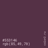 Цвет #553146 в цветовой модели RGB обозначается тремя октетами (85, 49, 70) в десятичном формате и #553146 в шестнадцатиричном (hex) формате, которые являются интенсивностью красного 85 (hex 55), интенсивность зелёного 49 (hex 31) и интенсивность синего 70 (hex 46).