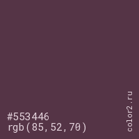 Цвет #553446 в цветовой модели RGB обозначается тремя октетами (85, 52, 70) в десятичном формате и #553446 в шестнадцатиричном (hex) формате, которые являются интенсивностью красного 85 (hex 55), интенсивность зелёного 52 (hex 34) и интенсивность синего 70 (hex 46).