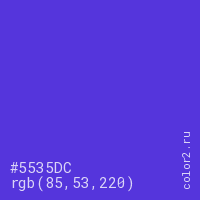 Цвет #5535DC в цветовой модели RGB обозначается тремя октетами (85, 53, 220) в десятичном формате и #5535DC в шестнадцатиричном (hex) формате, которые являются интенсивностью красного 85 (hex 55), интенсивность зелёного 53 (hex 35) и интенсивность синего 220 (hex DC).
