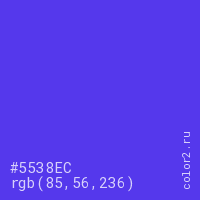 Цвет #5538EC в цветовой модели RGB обозначается тремя октетами (85, 56, 236) в десятичном формате и #5538EC в шестнадцатиричном (hex) формате, которые являются интенсивностью красного 85 (hex 55), интенсивность зелёного 56 (hex 38) и интенсивность синего 236 (hex EC).