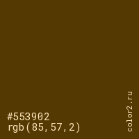 Цвет #553902 в цветовой модели RGB обозначается тремя октетами (85, 57, 2) в десятичном формате и #553902 в шестнадцатиричном (hex) формате, которые являются интенсивностью красного 85 (hex 55), интенсивность зелёного 57 (hex 39) и интенсивность синего 2 (hex 02).