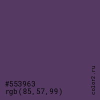 Цвет #553963 в цветовой модели RGB обозначается тремя октетами (85, 57, 99) в десятичном формате и #553963 в шестнадцатиричном (hex) формате, которые являются интенсивностью красного 85 (hex 55), интенсивность зелёного 57 (hex 39) и интенсивность синего 99 (hex 63).