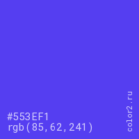 Цвет #553EF1 в цветовой модели RGB обозначается тремя октетами (85, 62, 241) в десятичном формате и #553EF1 в шестнадцатиричном (hex) формате, которые являются интенсивностью красного 85 (hex 55), интенсивность зелёного 62 (hex 3E) и интенсивность синего 241 (hex F1).