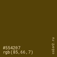 Цвет #554207 в цветовой модели RGB обозначается тремя октетами (85, 66, 7) в десятичном формате и #554207 в шестнадцатиричном (hex) формате, которые являются интенсивностью красного 85 (hex 55), интенсивность зелёного 66 (hex 42) и интенсивность синего 7 (hex 07).