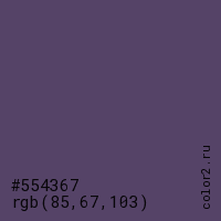 Цвет #554367 в цветовой модели RGB обозначается тремя октетами (85, 67, 103) в десятичном формате и #554367 в шестнадцатиричном (hex) формате, которые являются интенсивностью красного 85 (hex 55), интенсивность зелёного 67 (hex 43) и интенсивность синего 103 (hex 67).