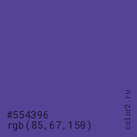 Цвет #554396 в цветовой модели RGB обозначается тремя октетами (85, 67, 150) в десятичном формате и #554396 в шестнадцатиричном (hex) формате, которые являются интенсивностью красного 85 (hex 55), интенсивность зелёного 67 (hex 43) и интенсивность синего 150 (hex 96).