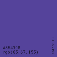 Цвет #55439B в цветовой модели RGB обозначается тремя октетами (85, 67, 155) в десятичном формате и #55439B в шестнадцатиричном (hex) формате, которые являются интенсивностью красного 85 (hex 55), интенсивность зелёного 67 (hex 43) и интенсивность синего 155 (hex 9B).