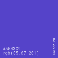 Цвет #5543C9 в цветовой модели RGB обозначается тремя октетами (85, 67, 201) в десятичном формате и #5543C9 в шестнадцатиричном (hex) формате, которые являются интенсивностью красного 85 (hex 55), интенсивность зелёного 67 (hex 43) и интенсивность синего 201 (hex C9).