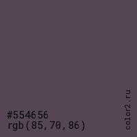 Цвет #554656 в цветовой модели RGB обозначается тремя октетами (85, 70, 86) в десятичном формате и #554656 в шестнадцатиричном (hex) формате, которые являются интенсивностью красного 85 (hex 55), интенсивность зелёного 70 (hex 46) и интенсивность синего 86 (hex 56).