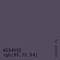 Цвет #55495E в цветовой модели RGB обозначается тремя октетами (85, 73, 94) в десятичном формате и #55495E в шестнадцатиричном (hex) формате, которые являются интенсивностью красного 85 (hex 55), интенсивность зелёного 73 (hex 49) и интенсивность синего 94 (hex 5E).