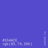 Цвет #554ACE в цветовой модели RGB обозначается тремя октетами (85, 74, 206) в десятичном формате и #554ACE в шестнадцатиричном (hex) формате, которые являются интенсивностью красного 85 (hex 55), интенсивность зелёного 74 (hex 4A) и интенсивность синего 206 (hex CE).