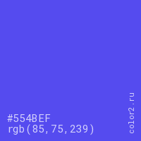 Цвет #554BEF в цветовой модели RGB обозначается тремя октетами (85, 75, 239) в десятичном формате и #554BEF в шестнадцатиричном (hex) формате, которые являются интенсивностью красного 85 (hex 55), интенсивность зелёного 75 (hex 4B) и интенсивность синего 239 (hex EF).