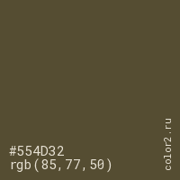Цвет #554D32 в цветовой модели RGB обозначается тремя октетами (85, 77, 50) в десятичном формате и #554D32 в шестнадцатиричном (hex) формате, которые являются интенсивностью красного 85 (hex 55), интенсивность зелёного 77 (hex 4D) и интенсивность синего 50 (hex 32).