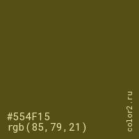 Цвет #554F15 в цветовой модели RGB обозначается тремя октетами (85, 79, 21) в десятичном формате и #554F15 в шестнадцатиричном (hex) формате, которые являются интенсивностью красного 85 (hex 55), интенсивность зелёного 79 (hex 4F) и интенсивность синего 21 (hex 15).