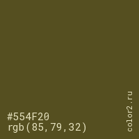 Цвет #554F20 в цветовой модели RGB обозначается тремя октетами (85, 79, 32) в десятичном формате и #554F20 в шестнадцатиричном (hex) формате, которые являются интенсивностью красного 85 (hex 55), интенсивность зелёного 79 (hex 4F) и интенсивность синего 32 (hex 20).