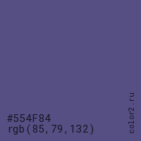 Цвет #554F84 в цветовой модели RGB обозначается тремя октетами (85, 79, 132) в десятичном формате и #554F84 в шестнадцатиричном (hex) формате, которые являются интенсивностью красного 85 (hex 55), интенсивность зелёного 79 (hex 4F) и интенсивность синего 132 (hex 84).