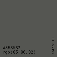 Цвет #555652 в цветовой модели RGB обозначается тремя октетами (85, 86, 82) в десятичном формате и #555652 в шестнадцатиричном (hex) формате, которые являются интенсивностью красного 85 (hex 55), интенсивность зелёного 86 (hex 56) и интенсивность синего 82 (hex 52).