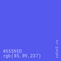 Цвет #5559ED в цветовой модели RGB обозначается тремя октетами (85, 89, 237) в десятичном формате и #5559ED в шестнадцатиричном (hex) формате, которые являются интенсивностью красного 85 (hex 55), интенсивность зелёного 89 (hex 59) и интенсивность синего 237 (hex ED).