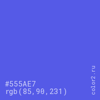 Цвет #555AE7 в цветовой модели RGB обозначается тремя октетами (85, 90, 231) в десятичном формате и #555AE7 в шестнадцатиричном (hex) формате, которые являются интенсивностью красного 85 (hex 55), интенсивность зелёного 90 (hex 5A) и интенсивность синего 231 (hex E7).