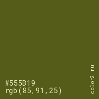 Цвет #555B19 в цветовой модели RGB обозначается тремя октетами (85, 91, 25) в десятичном формате и #555B19 в шестнадцатиричном (hex) формате, которые являются интенсивностью красного 85 (hex 55), интенсивность зелёного 91 (hex 5B) и интенсивность синего 25 (hex 19).