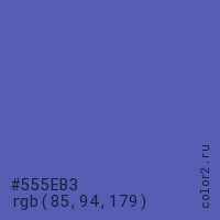 Цвет #555EB3 в цветовой модели RGB обозначается тремя октетами (85, 94, 179) в десятичном формате и #555EB3 в шестнадцатиричном (hex) формате, которые являются интенсивностью красного 85 (hex 55), интенсивность зелёного 94 (hex 5E) и интенсивность синего 179 (hex B3).