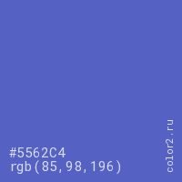 Цвет #5562C4 в цветовой модели RGB обозначается тремя октетами (85, 98, 196) в десятичном формате и #5562C4 в шестнадцатиричном (hex) формате, которые являются интенсивностью красного 85 (hex 55), интенсивность зелёного 98 (hex 62) и интенсивность синего 196 (hex C4).